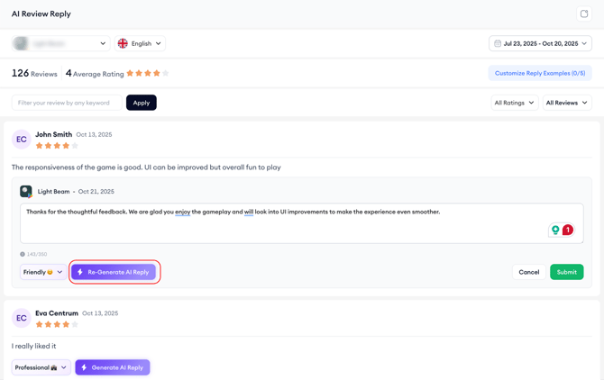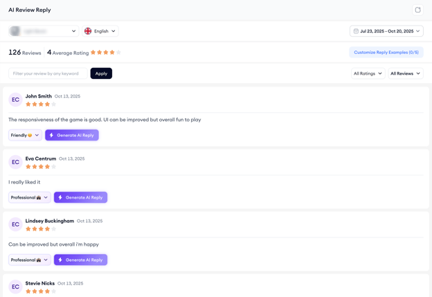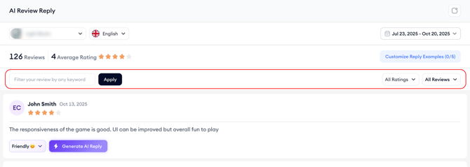 If you use the keyword filter, you can create a single, unified view that covers several similar reviews and generate AI replies, perfect for addressing common topics like “login issues” or “subscription questions” all at once.