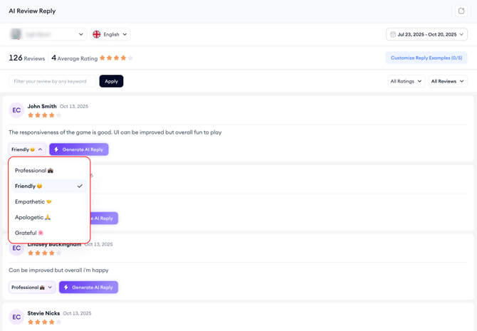 When you’re ready to respond, select any review and click Generate Reply. You’ll be able to pick a tone that fits the situation best: