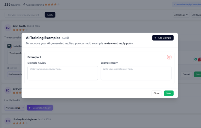 - You can add up to five custom example review–reply pairs per app. These examples guide the AI to write in your brand’s tone, but they’re completely optional; great results are still generated even without them.