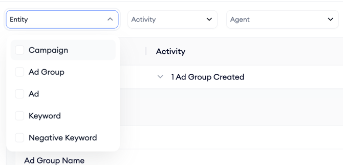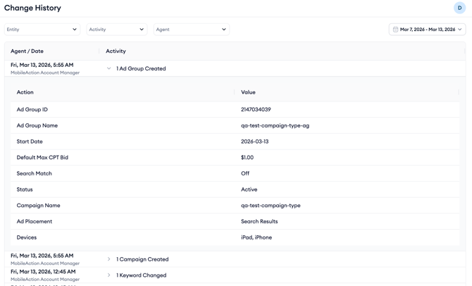 As you review the table, you can scan through actions to understand what was modified and track activity over time. To find a specific type of activity, filter the list according to Entity (Campaign, Ad Group, Ad, Keyword, Negative Keyword), Activity (Create, Duplicate, Update, Delete) or Agent (Manual, MobileAction Ads System and also includes MobileAction Account Manager, which is not available as a filtering option*).