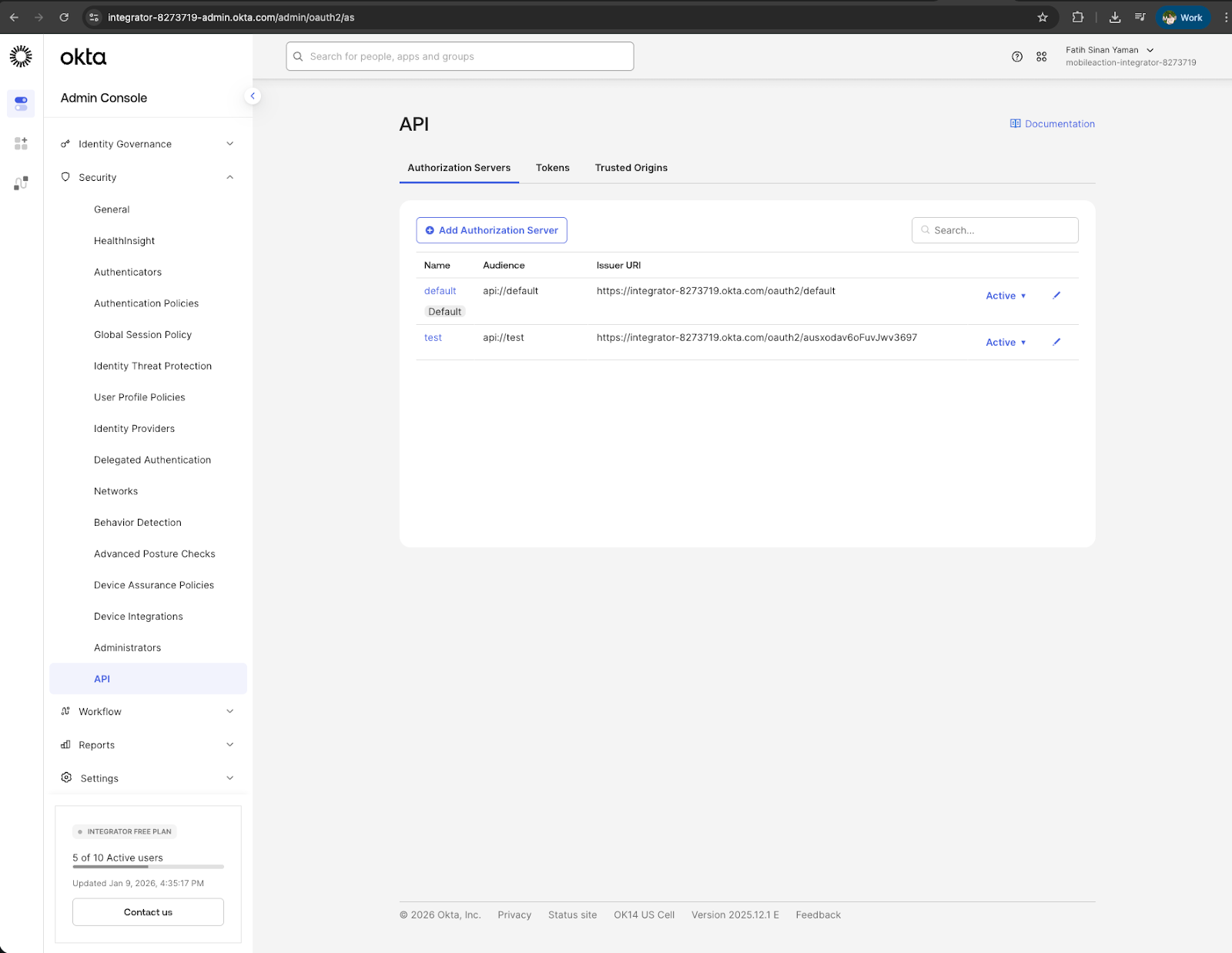 - Find your Issuer URI: Log in to your Okta Admin dashboard, navigate to Security > API, and click on the Authorization Servers tab.