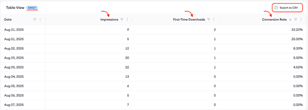 Lastly, you can drill into the table view. See daily metrics to pinpoint precisely when an increase or dip began, sort by highest impressions, highest first-time downloads, or highest/lowest conversion rate, and export the table to CSV for sharing or deeper analysis.
