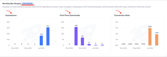 Scroll down to scan the last six-month’s values. A monthly section below breaks out impressions, first-time downloads, and conversion rate side by side for the last six months. These bars do not change with your initial date selection; use them to spot sustained trends and turning points.