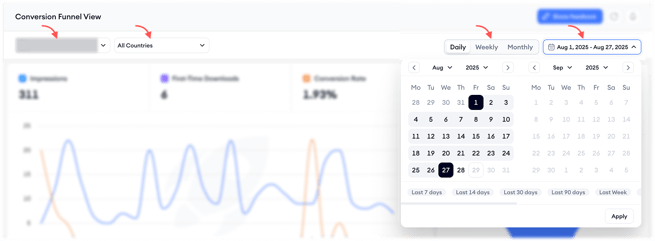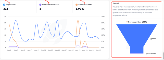 After completing the first step, you can read the top summary. You’ll find here the total impressions, first-time downloads, and conversion rate aggregated over your selected range; hover the chart to inspect daily values. The funnel on the right illustrates the step-by-step journey from impressions to conversions for your selected market and time period.