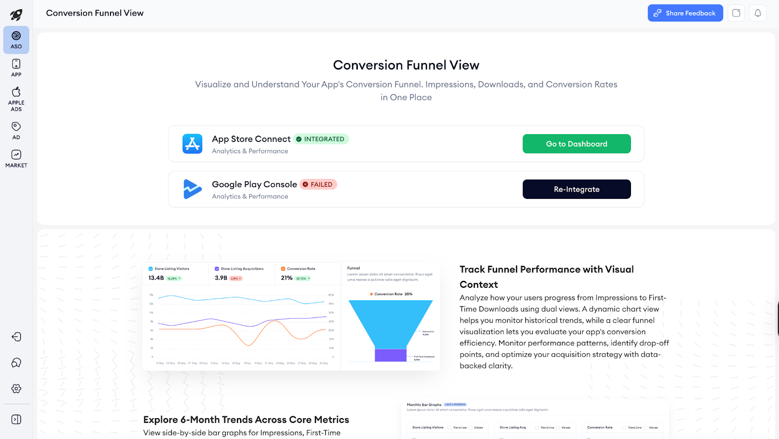 When you open the tool, if a landing page appears, you first need to integrate App Store Connect or Google Play Console for the Analytics & Performance modules. Once at least one is integrated, you will be able to proceed to the dashboard by clicking the Go to Dashboard button.