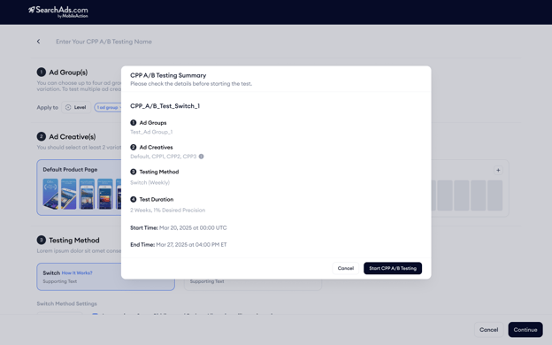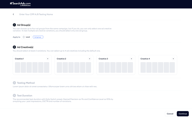- On the Testing Method screen, select Switch and keep Ad Groups as the switch entity. Then decide on the test duration.