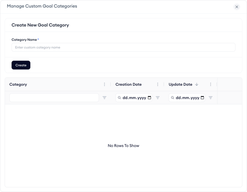 From here, enter a name for your new category and click Create. The category becomes available right away and can be selected for any goal. You’ll also see a list of existing custom categories, along with their creation and update dates. Categories that are no longer needed can be deleted directly from this view.