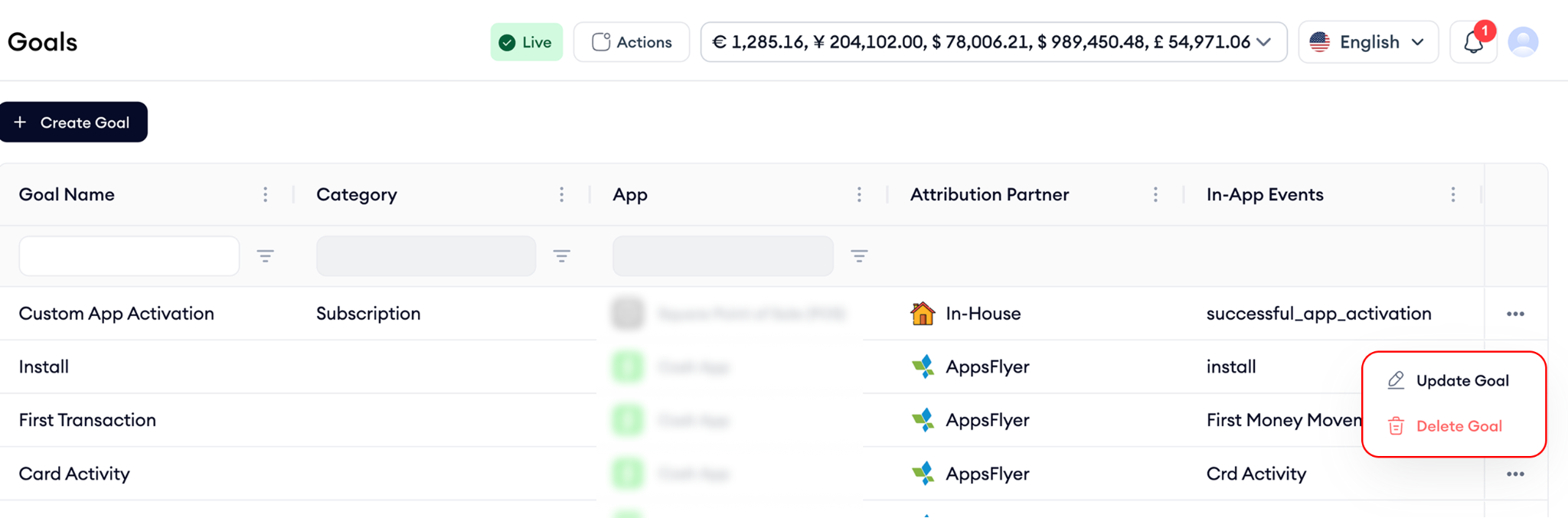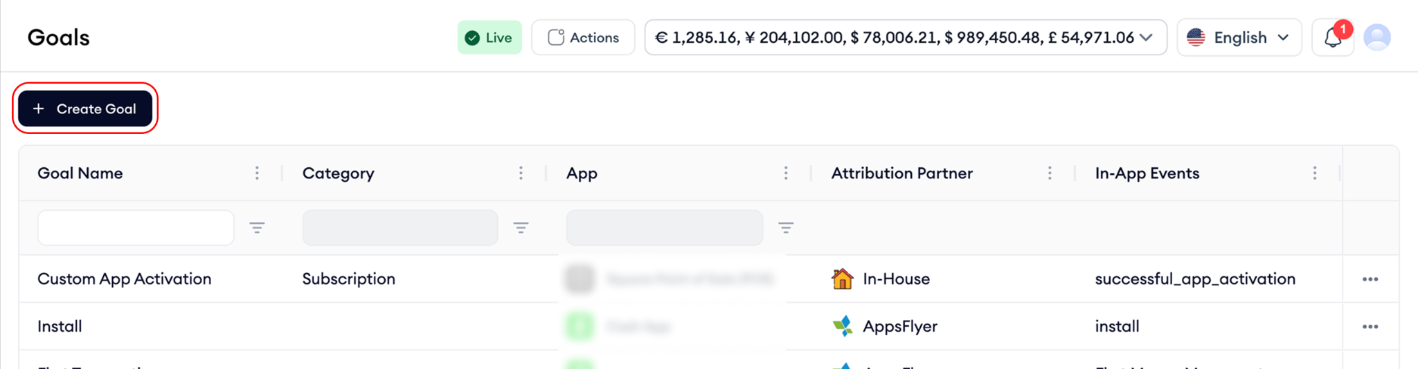 Each row represents a goal and includes key details such as the goal name, category, app, attribution partner, and the in-app events tied to that goal. This layout makes it easy to scan how goals are structured and where they’re being used. At the top of the page, you can create a new goal at any time using the Create Goal button.