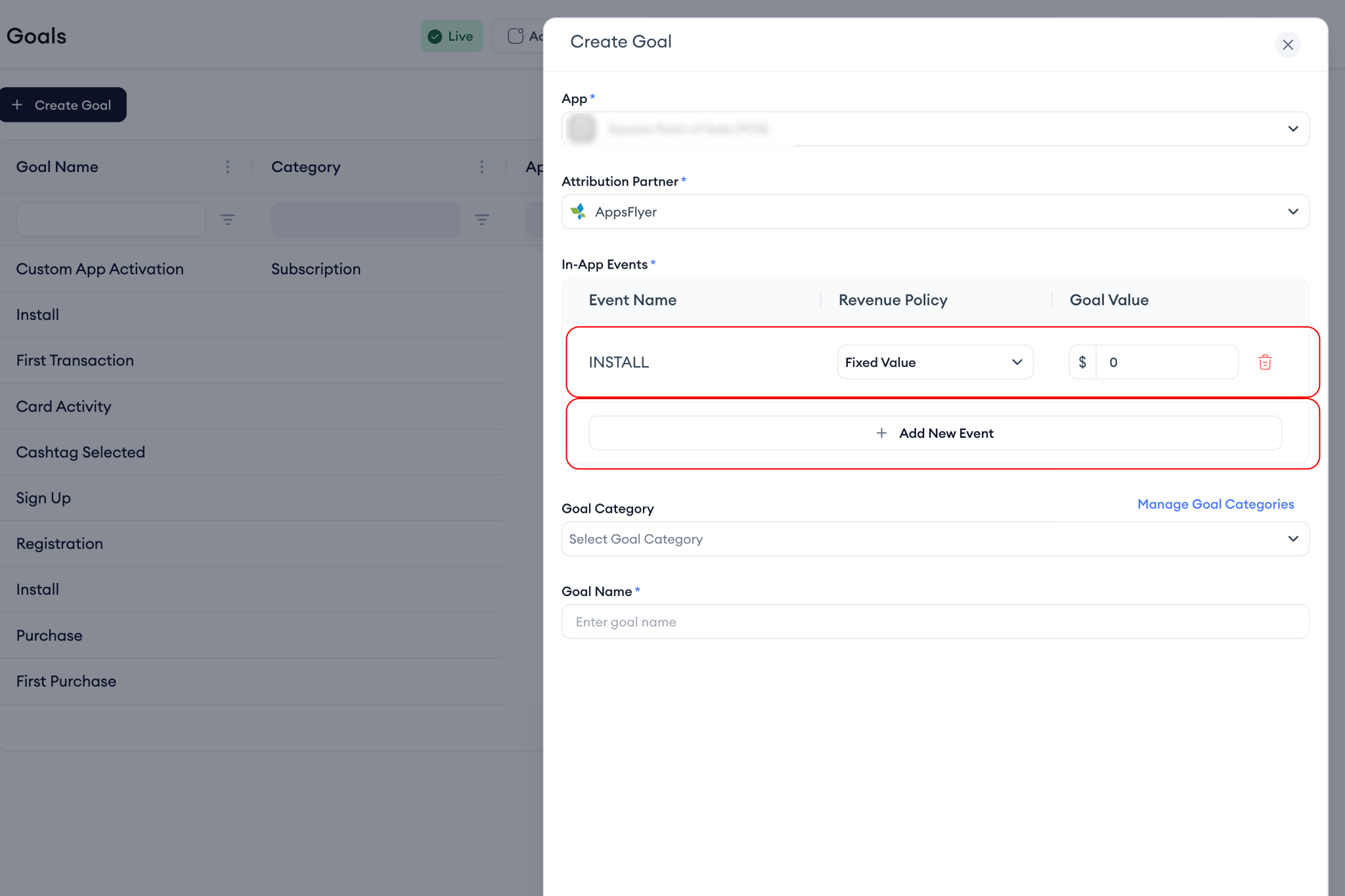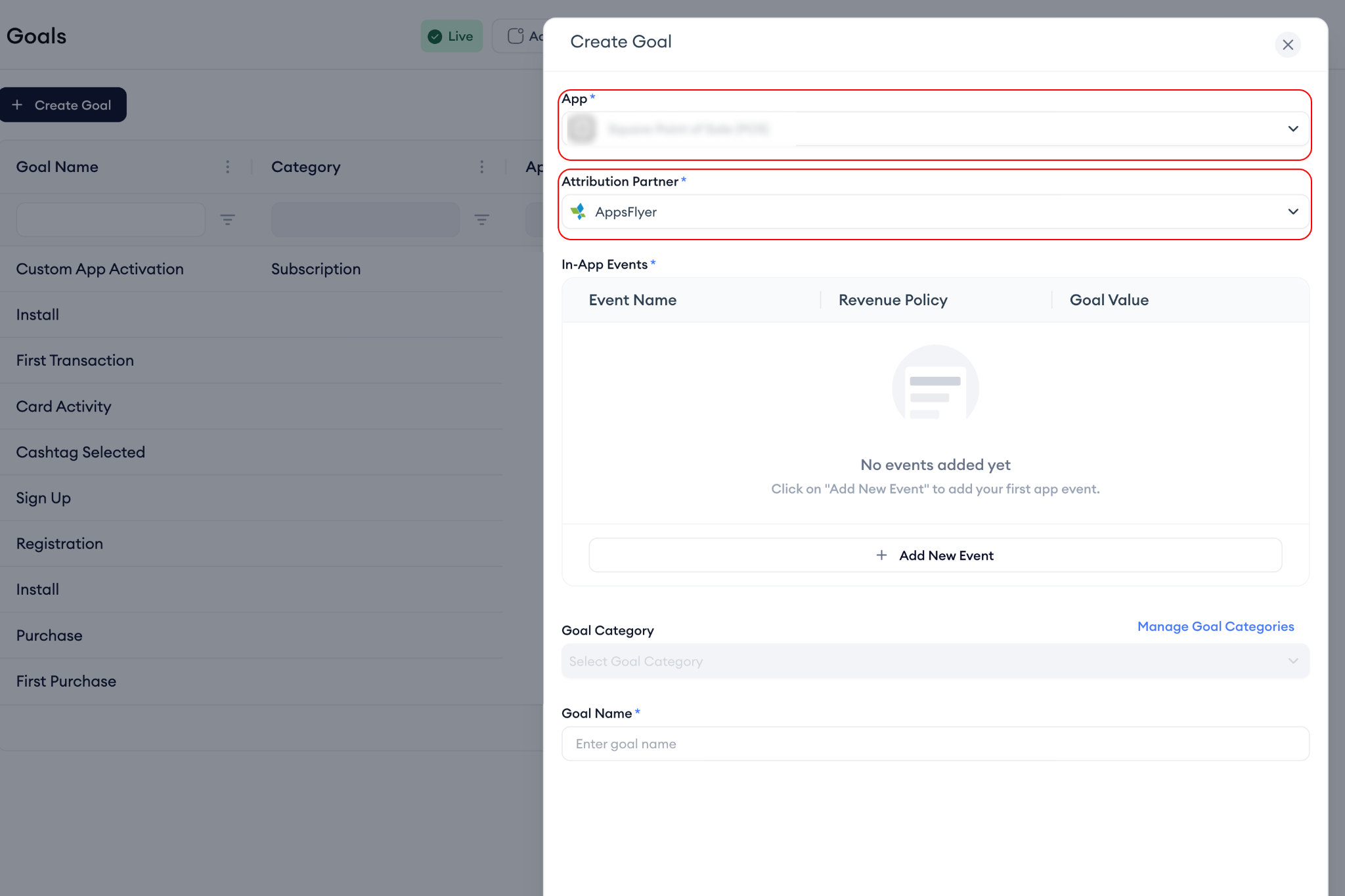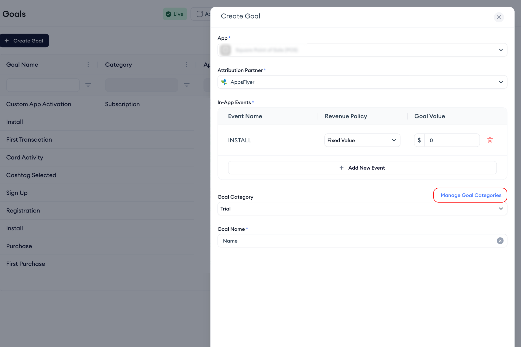 The Goals page is where you define and manage the in-app events that matter most for your app, from purchases to subscriptions, trials, and custom in-app events. This is a necessary step for you to see your attribution data.