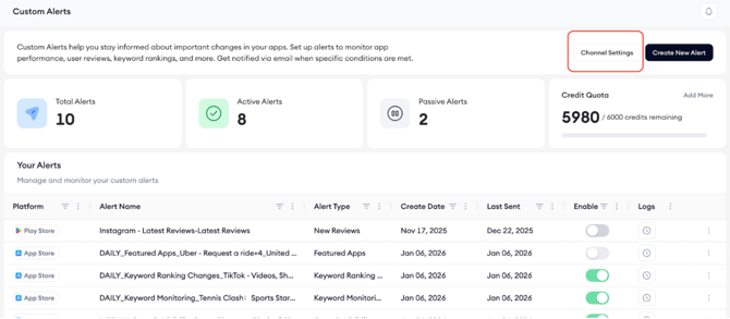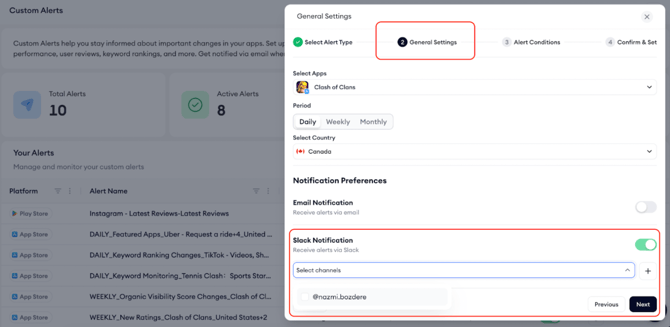 Custom alerts help you stay aware of important changes across your apps without constantly checking dashboards. By connecting with Slack, you can receive these alerts directly in your team’s workspace, making it easier to act on ranking shifts, review changes, visibility updates, or app store metadata changes as they happen.