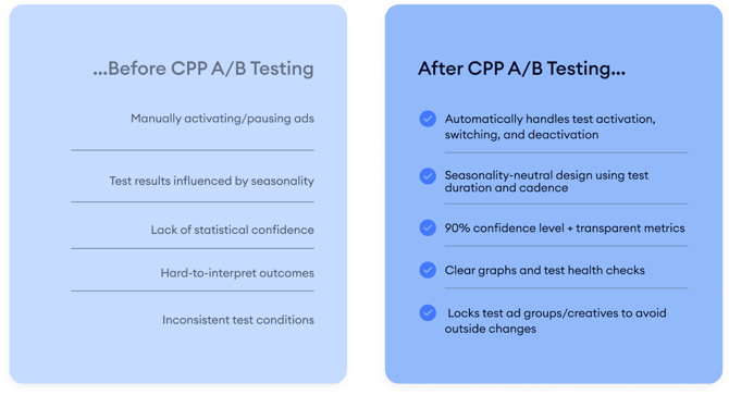 Instead of switching pages or ad groups by hand and trying to control timing, traffic, or seasonality yourself, CPP A/B Testing runs these experiments for you. The system isolates external factors such as time-of-day effects and traffic fluctuations, then evaluates results using a consistent statistical framework. This approach makes it easier to move forward with optimization decisions backed by reliable data.