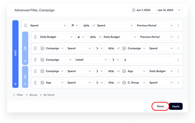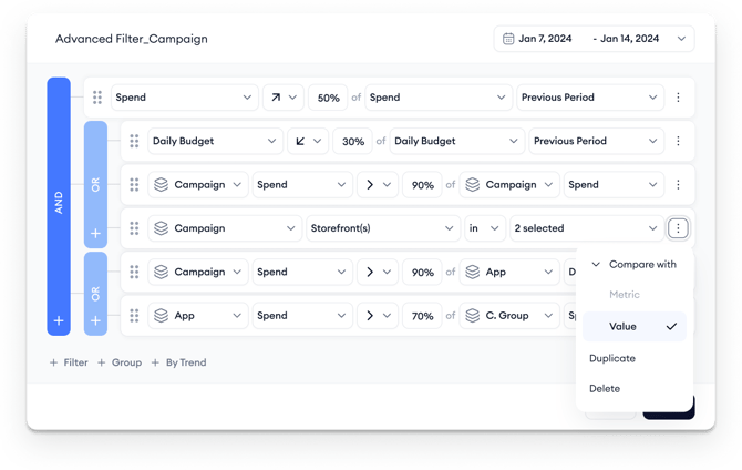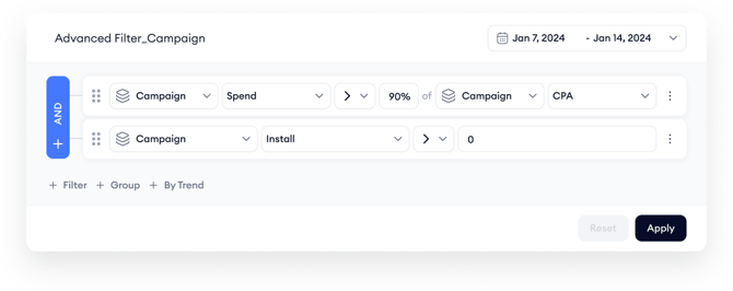 - + Group: Creates a sub-group of filters. This is useful for applying nested logic, like (TTR > 10% AND CR > 5%) OR Installs > 50.