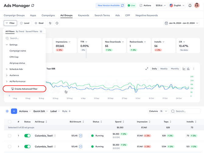 One filter per level: You can apply only one advanced filter at each level (Campaign, Ad Group, Keyword, etc.) at a time. If you want to apply a new one, you’ll need to remove the existing filter first.