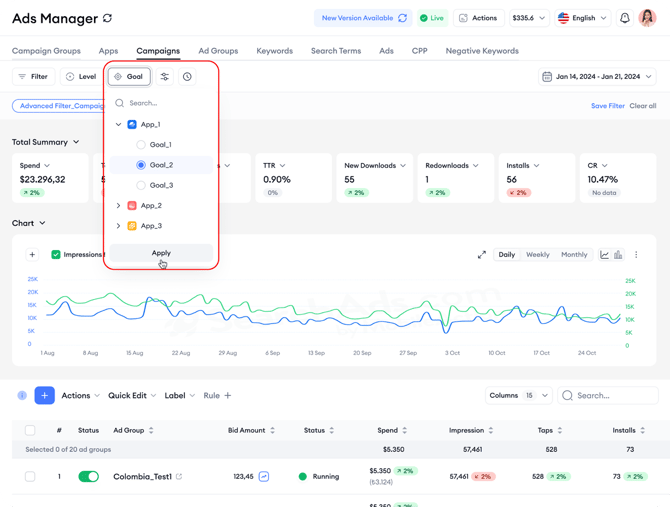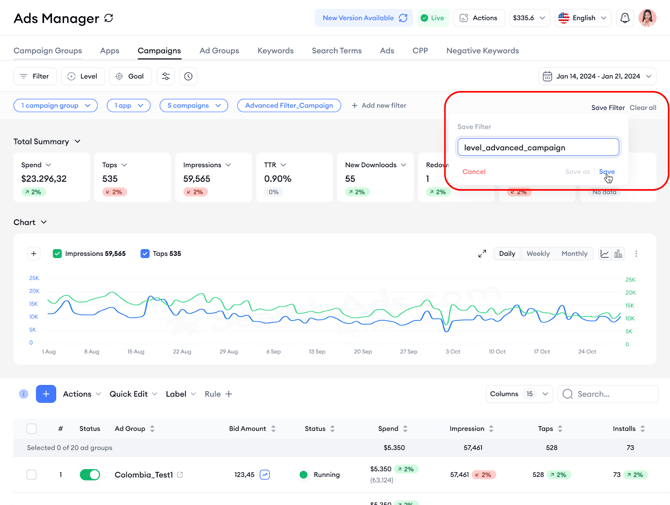 The Ads Manager interface offers numerous filtering and editing options to customize your dashboard. By default, the platform displays critical metrics such as spend, impressions, taps, installs, tap-through rate, conversion rate, average CPA, strategies, and goals, although the available metrics may vary by layer. You can also create custom metrics, utilize cohort analysis metrics or utilize MMP metrics on the dashboard.
