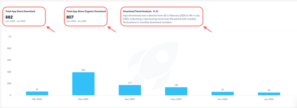 At the top of the page you can review total & organic downloads. See cumulative totals across your selected months, an AI summary comparing the first vs. last month, and a monthly bar chart of total downloads.