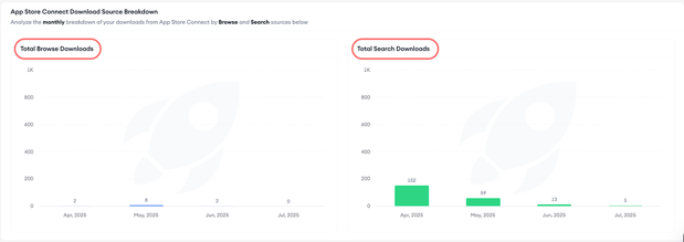 Scroll on the page to check the download source breakdown. For App Store Connect you’ll see Search and Browse; for the Google Play Console, you’ll see Search and Explore. Each source has its own monthly bars to tie shifts to metadata, creative, or featuring changes.