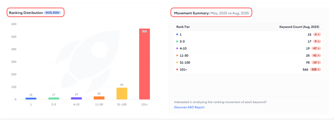 In this section you’ll also find the review ranking distribution across six tiers to understand how your terms stack up from top ranks to long tail. Next to it you can scan the movement summary, which compares tier distribution between your first and last months to highlight gains or losses in the most valuable tiers. Click the quick link below this graph to jump to ASO Report and inspect the actual terms.