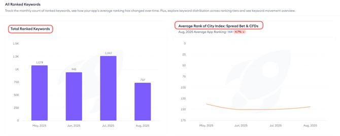 Below reviews, you can view total ranked keywords by month to see how your coverage expands or contracts. Check average rank of app, a weighted score of your overall ranking footprint; lower is better because it reflects stronger top-tier visibility.