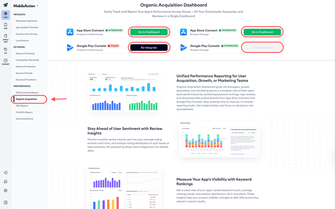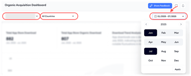 The Organic Acquisition Dashboard gives you a high-level summary of your app’s organic growth across the App Store and Google Play Store. It brings together downloads, reviews, and keyword rankings into a single monthly view so ASO managers, marketers, agencies, and product teams can monitor visibility, performance, and user sentiment, without stitching together multiple reports.