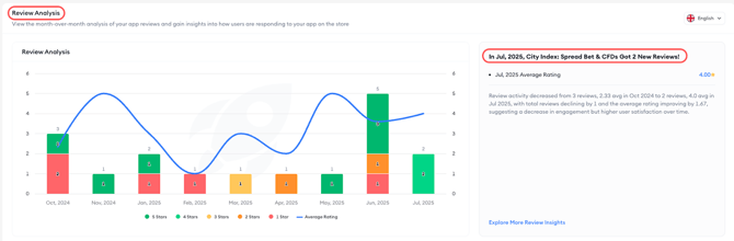 Next up you’ll see the review analysis section. Track monthly volume and quality with stacked bars (1–5 stars) and an overlaid average-rating line. An AI summary on the right explains changes over your range. App Store Connect follows your top-level country filter; while Google Play Console includes a language dropdown for this section.