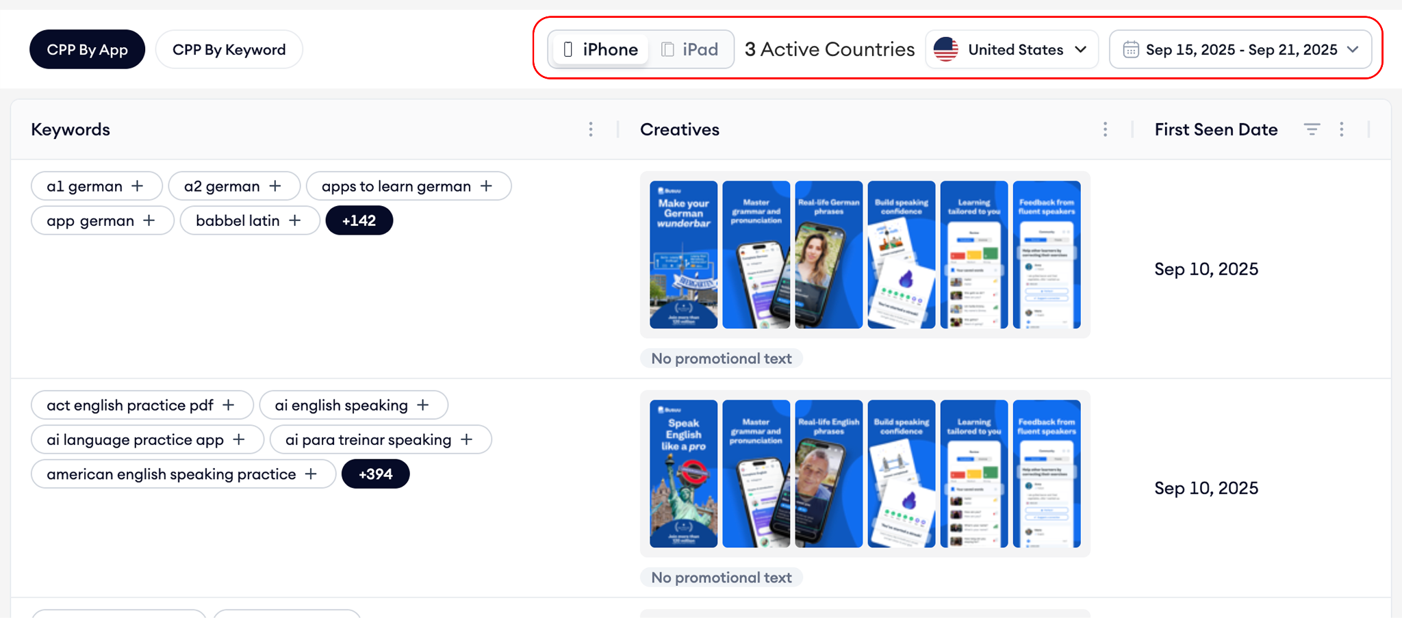 This tab helps you analyze which keywords are triggering custom product pages for a specific app, including its competitors. It’s a useful view for understanding how different apps tailor their creatives based on keyword intent.
