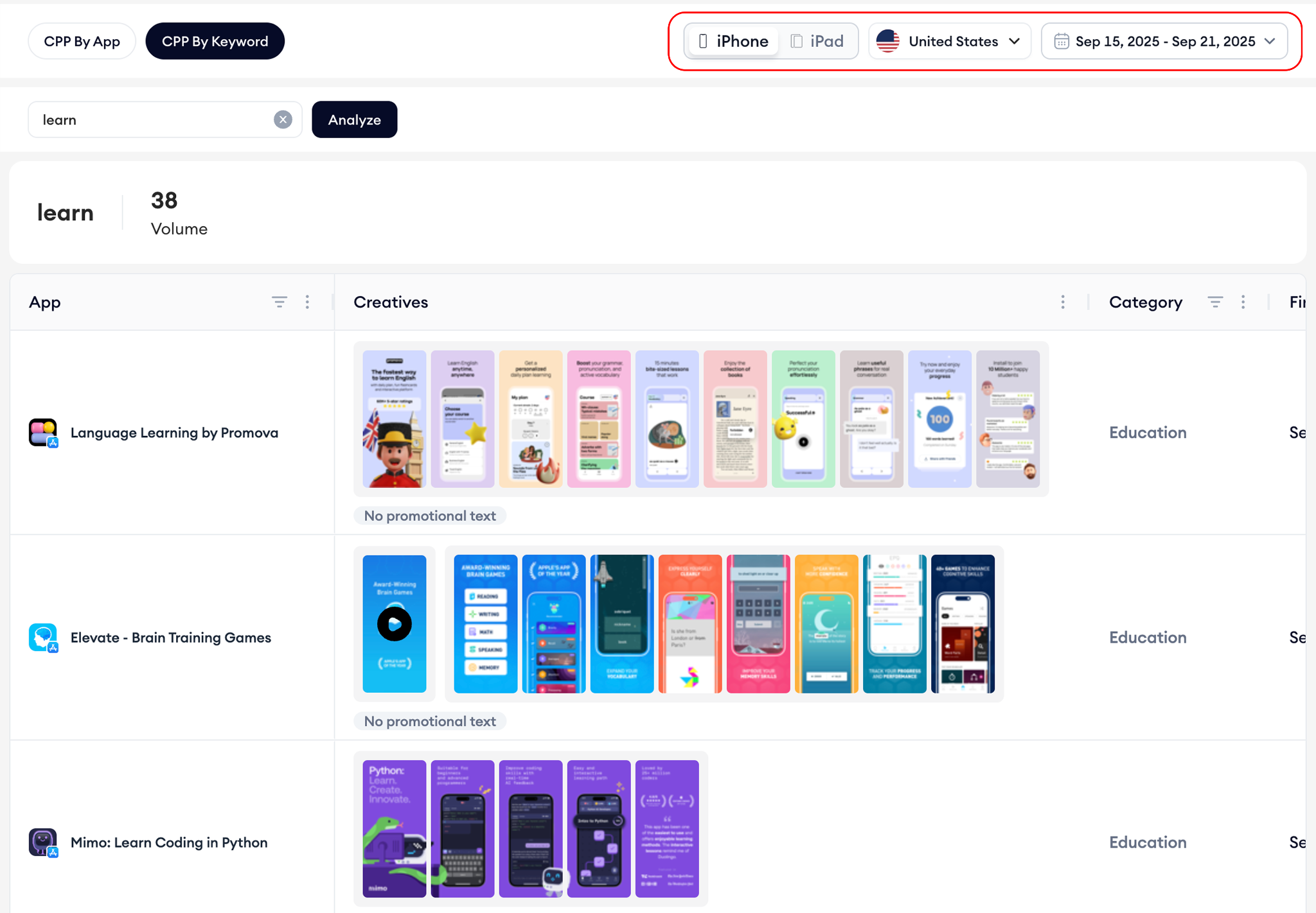 The Organic CPP Results page gives you a layer of visibility into how apps use custom product pages in organic search. Whether you're fine-tuning your keyword strategy, testing creative variations, or keeping an eye on competitors, this tool helps you spot what’s working, and where there’s room to grow.
