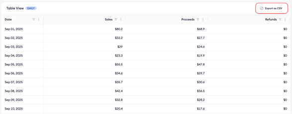 Table view. The table lists each period based on the granularity you selected and includes four columns: Date, Sales (the App Store) / Revenue (Google Play Store), Proceeds, and Refunds. It mirrors the same filters you set for the chart, so you can move between visual and tabular analysis without losing context. The full table is exportable for reporting.