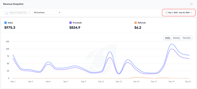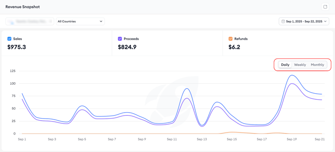 Pro tip: Choose weekly granularity when reviewing multiple countries. It helps you catch unusual swings in proceeds or refunds without the noise of daily views or the smoothing of monthly views.