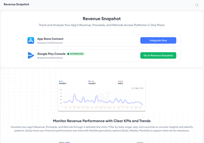 Revenue Snapshot is available once you connect at least one Analytics & Performance integration for App Store Connect or Google Play Console.